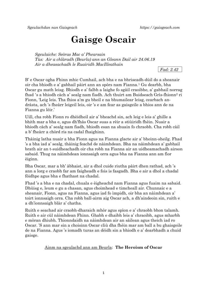 Gaisge Oscair Posted bygaisgeach28th An t-Ògmhios 20215th An t-Iuchar 2021Posted inUncategorized Ealain le Anna NicilleDhuibh Luchdaich a-nuas PDF den sgeulachd: 1_Gaisge OscairDownload ÈIST (2.42): 'S toil 'Ga luchdadh... Co-cheangailte