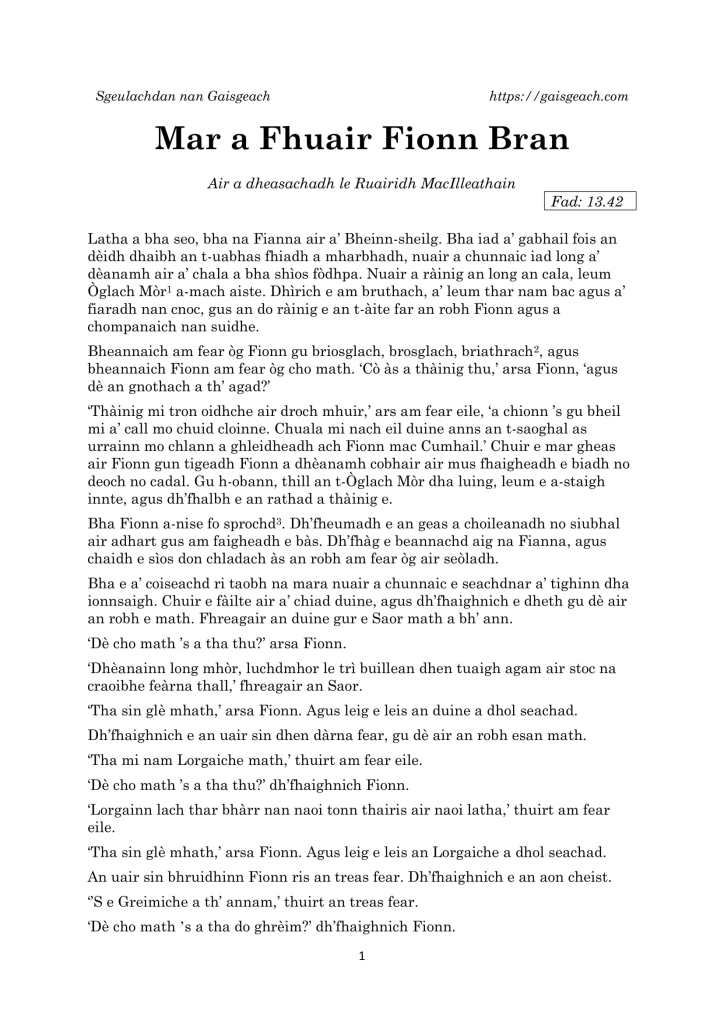 Mar a Fhuair Fionn Bran Posted bygaisgeach28th An t-Ògmhios 20215th An t-Iuchar 2021Posted inUncategorized Ealain le Anna NicilleDhuibh Luchdaich a-nuas PDF den sgeulachd: 1_Mar a Fhuair Fionn BranDownload ÈIST (13.42): 'S toil 'Ga luchdadh... Co-cheangailte